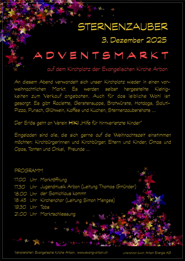 Am 2. Dezember verbreitet sich von 17 – 21 Uhr wieder der „Sternenzauber“ auf unserem Kirchplatz. Es werden selbsthergestellte Kleinigkeiten zum Verkauf angeboten. Verpflegen können Sie sich mit Raclette, Gerstensuppe, Bratwurst, Hotdog, Saluti-Pizza, Punsch, Glühwein, Kaffee und Kuchen, Sternenzaubershots … Der Erlös geht an den Verein Hiki – Hilfe für hirnverletzte Kinder.