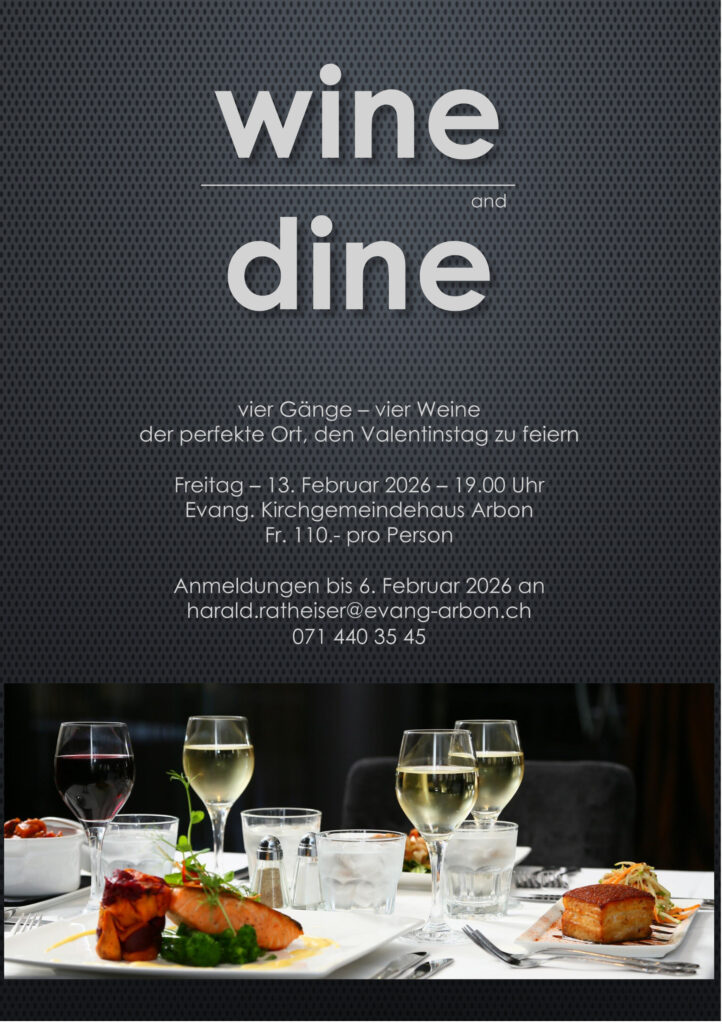 Unser «wine & dine» ist eine wunderschöne Art, den Valentinstag in gediegenem Ambiente zu feiern. Es erwartet dich ein Vier-Gang-Menü mit vier passenden Weinen. Ab sofort und bis am 6. Februar 2026 kannst du dich anmelden – per Email an harald.ratheiser@evang-arbon.ch oder per Telefon an 071 440 35 45. Die Teilnehmerzahl ist auf mindestens 24 und maximal 40 Personen begrenzt. Die Kosten betragen CHF 110.– pro Person.